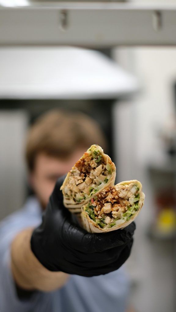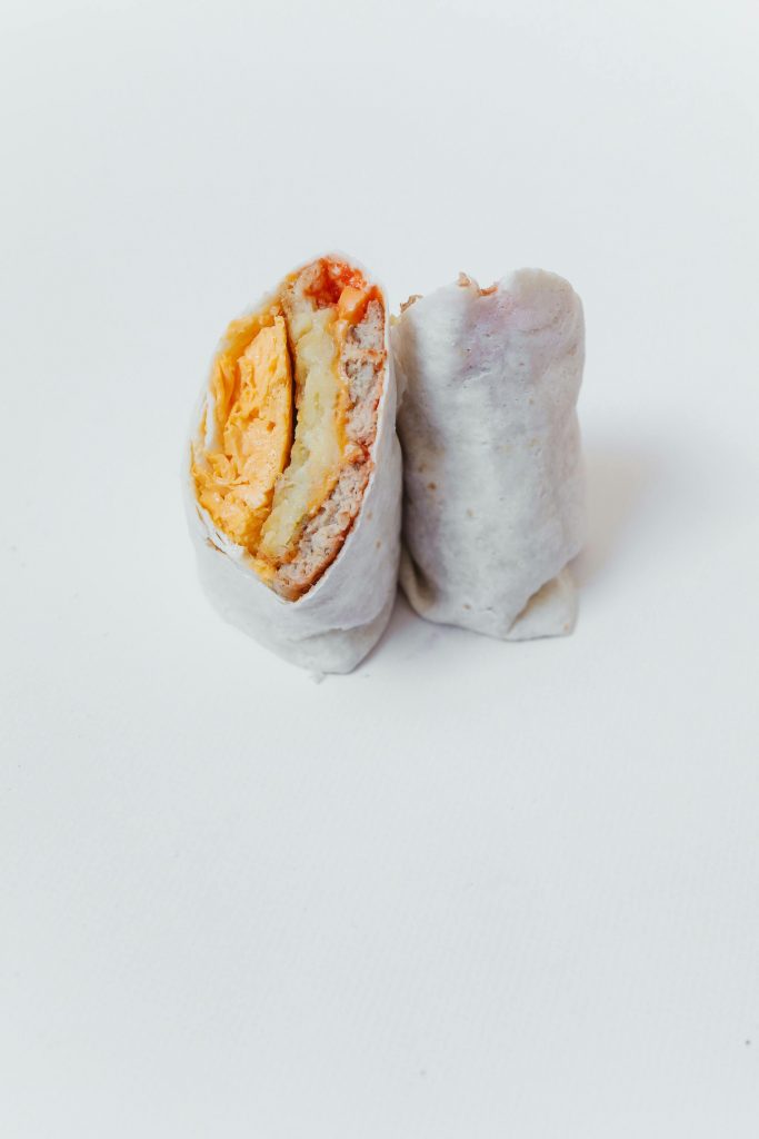- Dobla los lados de cada tortilla hacia adentro, luego enrolla la parte inferior hacia arriba sobre los ingredientes y continúa enrollando hasta formar un burrito apretado.