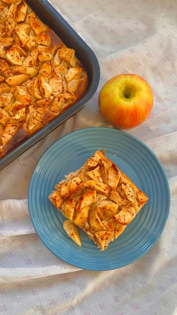 - Sirve la tarta de manzana y canela caliente o a temperatura ambiente, acompañada de helado de vainilla o una cucharada de crema batida.